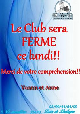Le club sera exceptionnellement fermé ce lundi!!